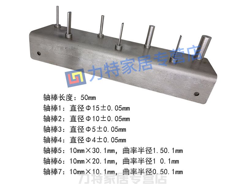 由粗细口径不同的七个钢制轴棒组成。固定于座架上,座架可用螺钉固定在试验台的桌子边上。各轴棒的尺寸如下: