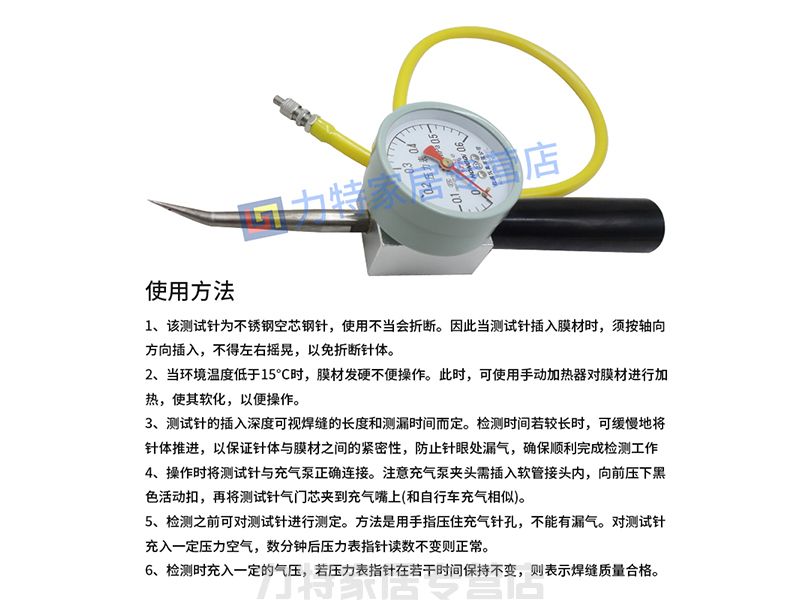 3、测试针的插入深度可视焊缝的长度和测漏时间而定。检测时间若较长时,可缓慢地将针体推进,以保证针体与膜材之间的紧密性,防止针眼处漏气,确保顺利完成检测工作